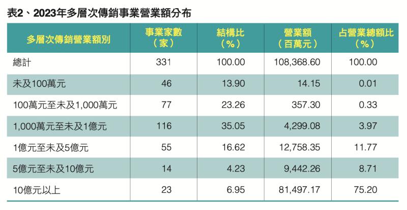 觀察營業額規模家數分布情形,營業額介於1000萬~1億元的事業家數最多,有116家(占事業總家數35.05%),營業額合計約42.99億元,占整體營業額3.97%;也就是說,有超過1/3的直銷事業營業額不到1億,而其業績加總還不及排名第六大的事業。