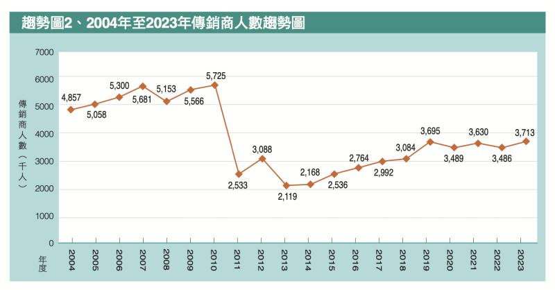 依據331家直銷事業的資料顯示,2023年底傳銷商人數達到371.3萬人,較2022年底348.6萬人,增加22.7萬人。但因部分傳銷商重複參加1家以上,經剔除重複加入人數後,傳銷商人數為369.4萬人。依內政部統計資料,我國2023年底人口數約為2,342.04萬人,因此,加入傳銷率(參加傳銷人數占全國總人口數之比率)約15.77%,即平均每萬人中有1577人加入多層次傳銷,較2022年底之14.93%,增加0.84個百分點。