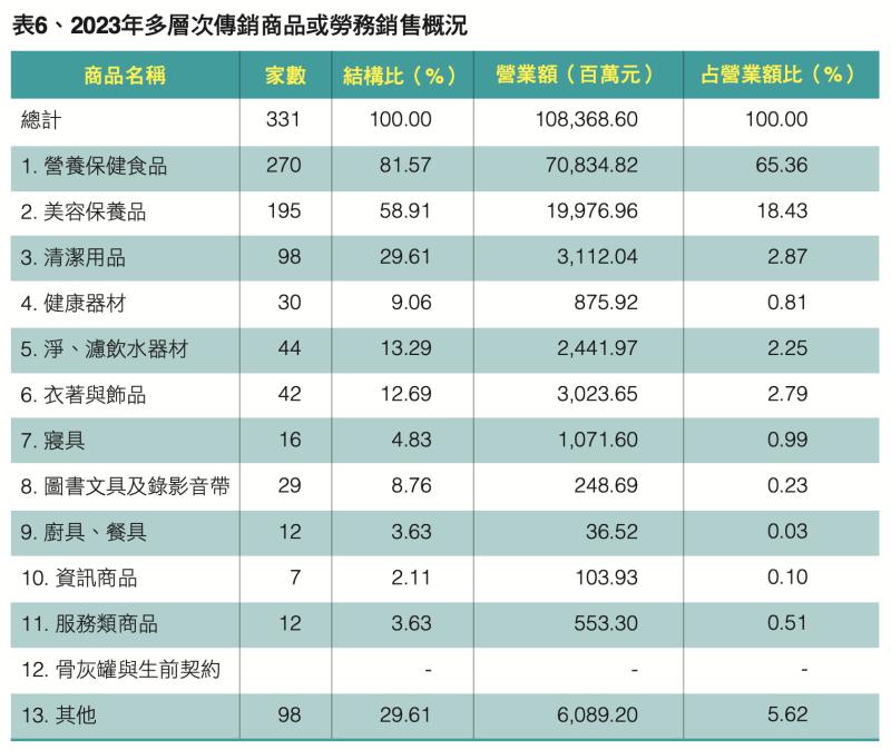 2023年,營養食品類仍為主要銷售商品,銷售家數有270家(占總家數81.57%),營業額約為708.35億元,已連續3年超過700億,占營業總額65.36%,撐起傳銷產業的大半片江山。其次為美容保養品,銷售的事業計有195家(占總家數58.91%),營業額約為199.77億元,占營業總額之18.43%。單這兩大類商品的營業額,合計已占營業總額的83.79%。