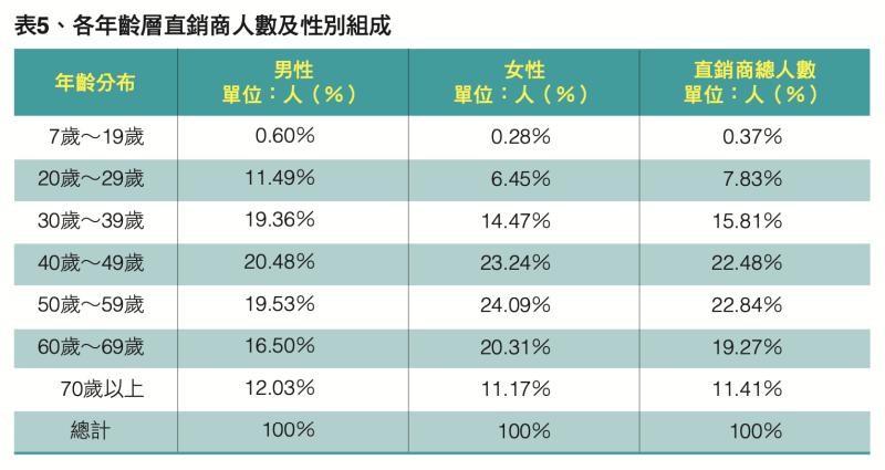 從年齡層分布來看,總體而言,以40~59歲者居多,佔總傳銷商人數的45.32%,60~69歲的也有將近20%,顯見傳銷商年齡層普遍偏高;若以性別來看,男性占比第三大的年齡區間落在30~39歲(19.36%),女性則落在60~69歲(20.31%),應與男性加入傳銷以事業型居多有關。