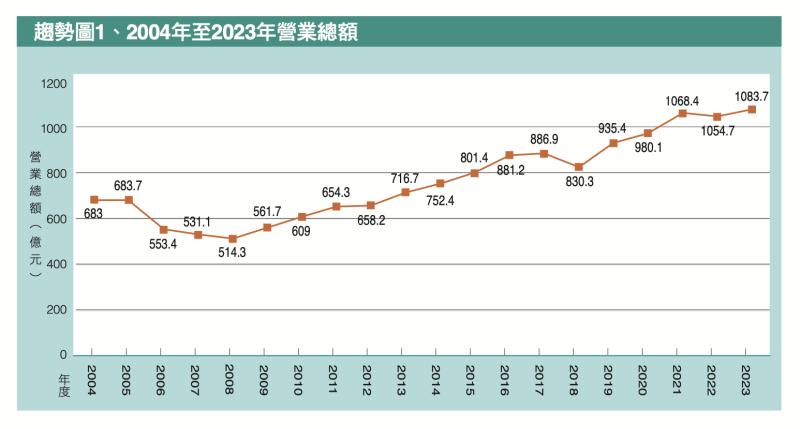 觀察2004年至2023年營業總額變化情形,整體來說呈現攀升趨勢。2003年成長20%,營業總額突破500億;2004年罕見大幅度成長31%,以683億達到第一波高峰,隨後即因大型公司的崩跌與市場策略調整,而爆出空前的下滑。