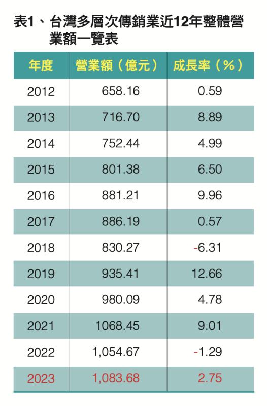 揮別疫情陰霾,2023年331家多層次傳銷事業的營業總額刷出了新高點,達到1,083.68億元,較2022年(1,054.67億元)增加29.01億元,成長率為2.75%;這是自2021年突破千億之後,第三年在這個基礎上追求成長,足見直銷千億的市場規模已經穩穩打開。