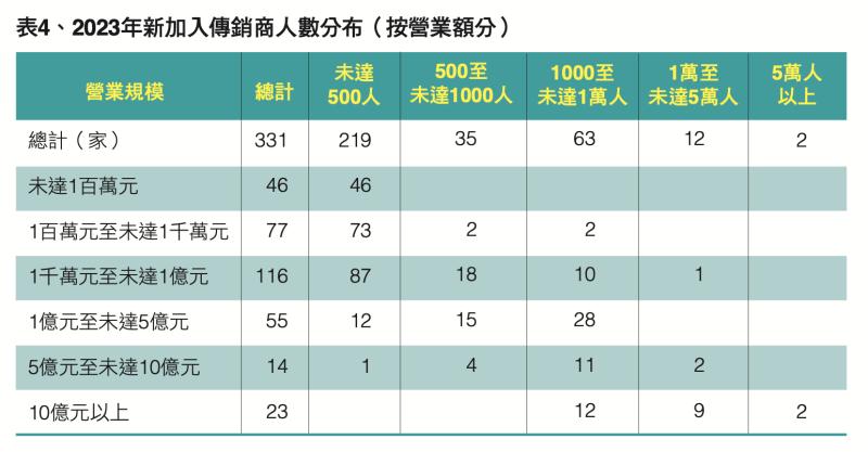 2023年新加入傳銷商人數計70萬人,占傳銷商總數(371.3萬人)的18.85%,較2022年新加入傳銷商人數(68.6萬人)增加1.4萬人。自新加入各事業之傳銷商人數規模分布觀之,以新加入傳銷商人數未達500人的事業為大宗,計219家(占66.16%),其次為新加入傳銷商1000人以上至未達1萬人之事業計有63家(占19.03%)。