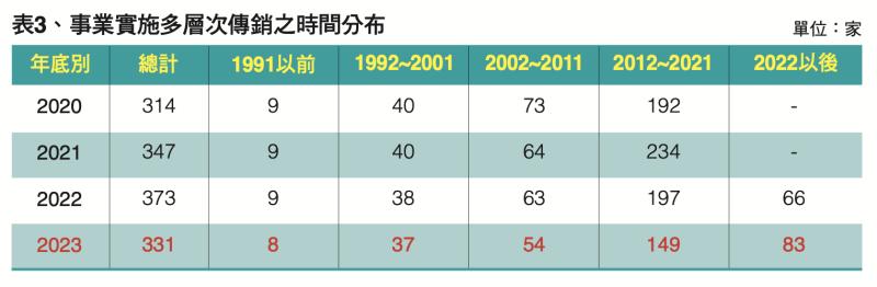 根據調查,最早實施直銷事業的業者開始於1985年。而就331家事業的報備實施時間觀察,以2012年至2021年實施多層次傳銷的事業計149家最多,占比高達45.02%;其次為2022年以後實施多層次傳銷的事業計83家,占25.08%,亦即市場上約有1/4的公司實施不滿3年。
