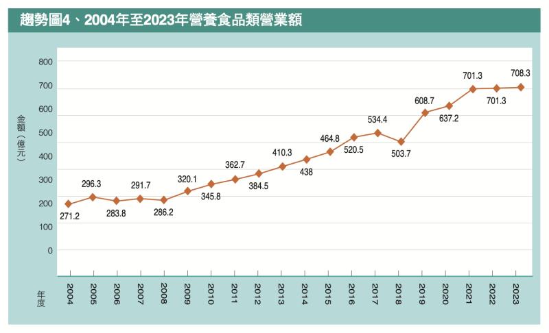 若以個別營業額來看,前三大類2023年的營業額均較2022年增加,其中營養食品類增加約7.05億元(成長約1.01%),美容保養品類增加約7.79億元(成長約4.06%),其他類增加約5.43億元(成長約9.79%)。