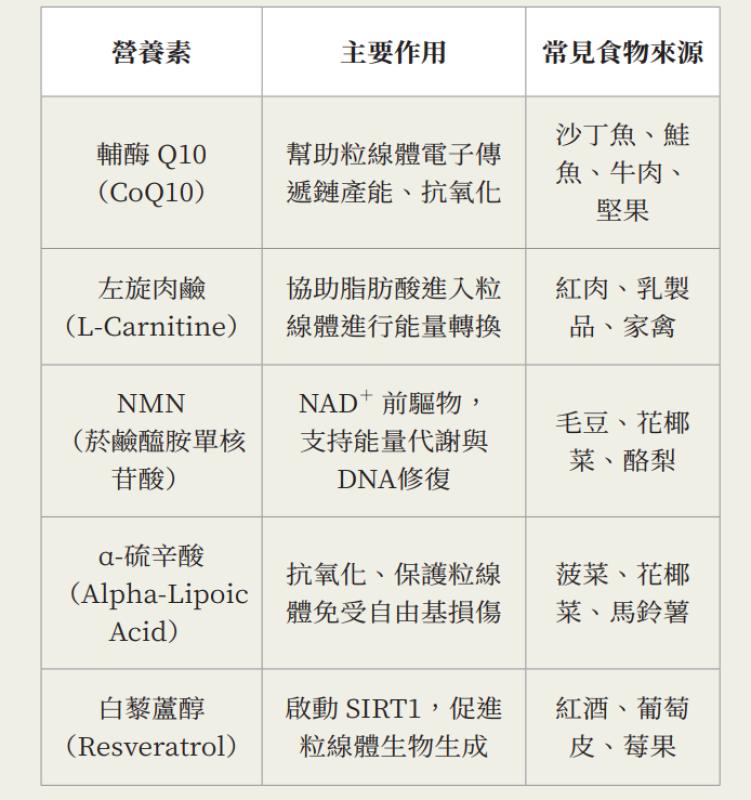 以下是科學研究中較常被提及、可能有助於維持粒線體功能的營養素:
