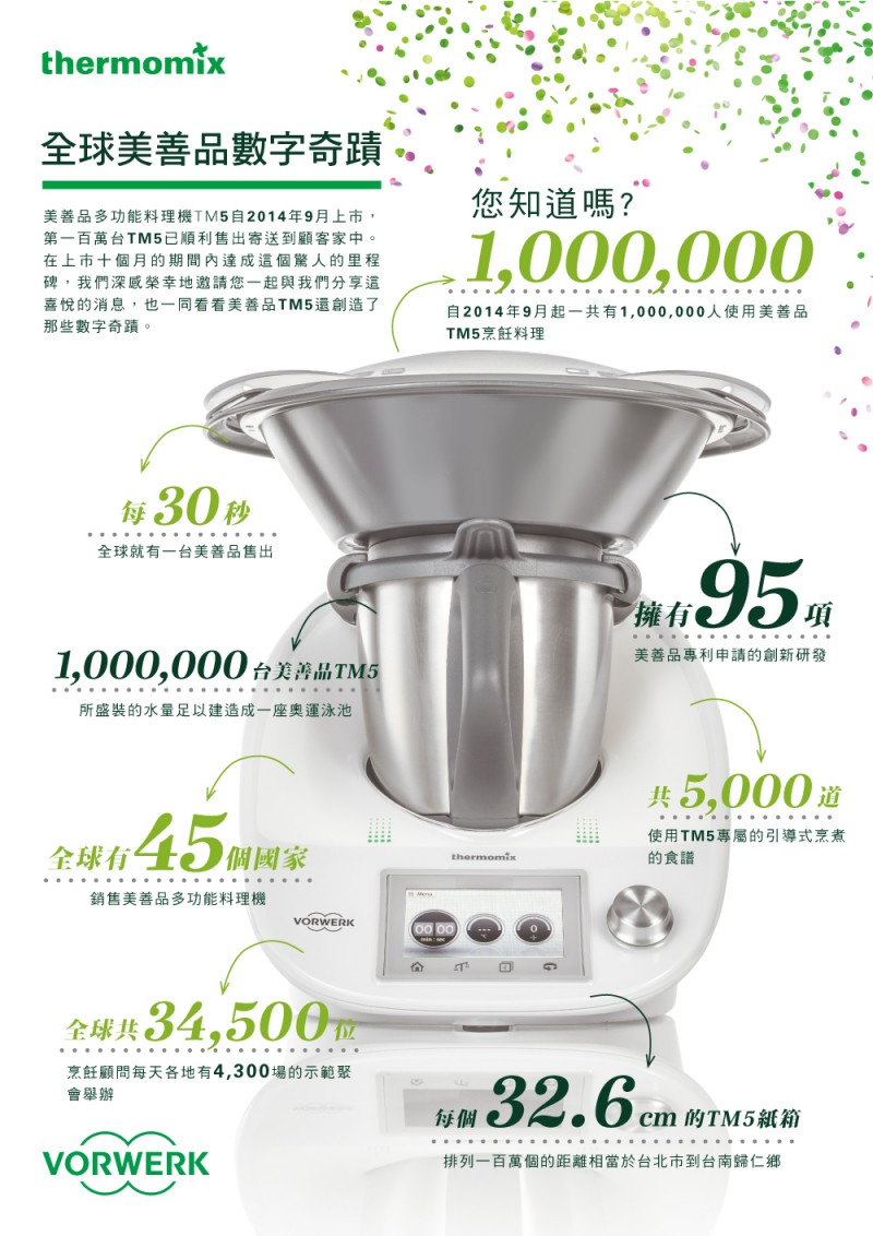 美善品多功能料理機TM5自2014年九月上市至今,全球銷售成績斐然,全世界的第一百萬台美善品TM5已從工廠出貨寄送到顧客家中。