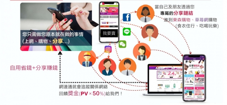 東森全球新連鎖事業的經銷商,基本上只要做到私領域導流,把FB、IG、LINE、微信、部落格變成工具,在朋友圈分享訊息、分享商品、分享商機,一個帶一個,把人導進商城購物,就能獲得一定比例的分潤。舉例來說,經營者在ETtoday看了一則訊息,或者在東森購物看到一個好商品,可以轉分享到自己的FB、LINE或微信,然後底下貼上你的網店鏈結,當朋友圈有人看到訊息,點選鏈結,只要有交易行為產生,系統就會追蹤關係網絡,計算獎金回饋。經銷商甚至可以變身行銷顧問,自行開發商家,一旦商家加入成為東森購物的夥伴商店,或者在東森旗下的樓宇廣告媒體「分眾傳媒」上刊廣告,一樣可享有獎金回饋。