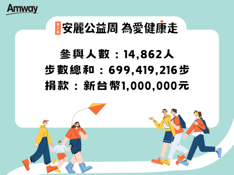 為期7天的活動,共吸引 14,862 人參與,無論是個人組或首次增設的團體組,眾人目標一致,齊心為愛健走、積極集步,最終步數總和突破6億9千9百萬步,而安麗台灣也兌現承諾,捐出新台幣100萬公益金予「安麗希望工場慈善基金會」,將用以持續推動各項公益資助計畫,為社會帶來正向改變。