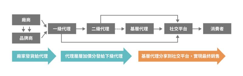 - 品牌微商:企業自建品牌、自產產品,發展層層代理,建立團隊,借助微信、微博等社交平台分銷。