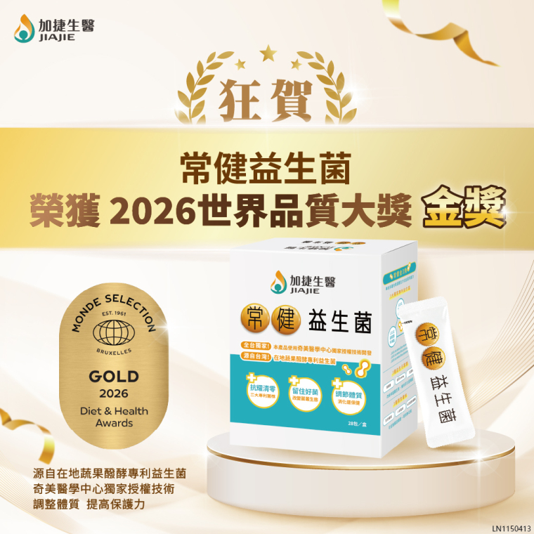 台鋼集團旗下加捷生醫深耕健康產業 30 幾年,明星產品「常健益生菌」榮獲2026 年世界品質大獎(Monde Selection)金獎殊榮。